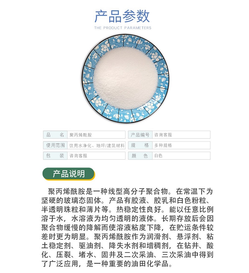 造紙助劑:在造紙工業(yè)中可用作紙張干強(qiáng)劑 助留劑 ,能極大的提高紙張質(zhì)量 節(jié)約成本,提高造紙廠的生產(chǎn)能力。可以直接與無(wú)機(jī)鹽離子,纖維以及其它有機(jī)高分子發(fā)生靜電橋梁作用以達(dá)到增強(qiáng)紙張的物理強(qiáng)度,減少纖維或填料的流失。加快濾水 起到了增強(qiáng)  助留 助濾的作用,同時(shí)在脫模過(guò)程中起到了明顯的絮凝效果。